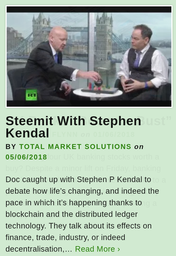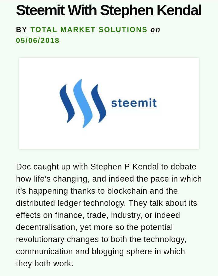 Doc caught up with Stephen P Kendal to debate how life’s changing, and indeed the pace in which it’s happening thanks to blockchain and the distributed ledger technology. They talk about its effects on finance, trade, industry, or indeed decentralisation, yet more so the potential revolutionary changes to both the technology, communication and blogging sphere in which they both work.