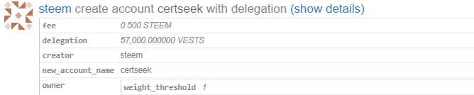 So I done the same with certseek. It appears here that certseek was created through @Steem with a 0.500 fee.