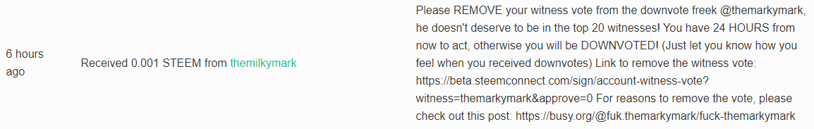 Please REMOVE your witness vote from the downvote freek @themarkymark, he doesn't deserve to be in the top 20 witnesses! You have 24 HOURS from now to act, otherwise you will be DOWNVOTED! (Just let you know how you feel when you received downvotes) Link to remove the witness vote: https://beta.steemconnect.com/sign/account-witness-vote?witness=themarkymark&approve=0 For reasons to remove the vote, please check out this post: https://busy.org/@fuk.themarkymark/fuck-themarkymark