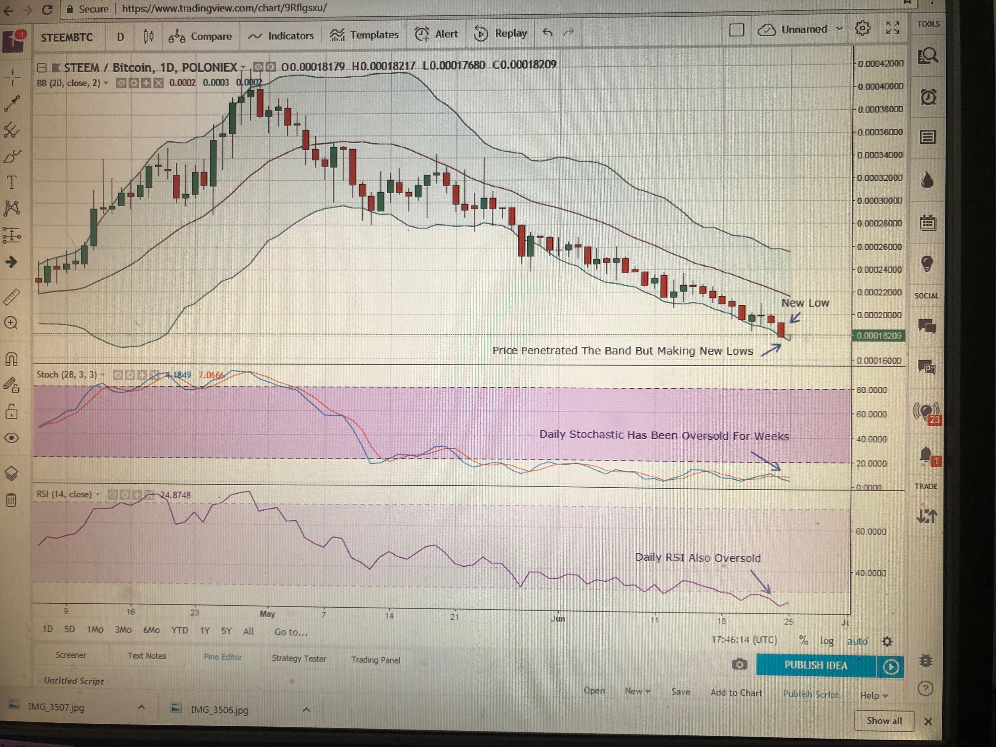 The chartist will be watching closely when and (if) the price penetrates the weekly lower band.