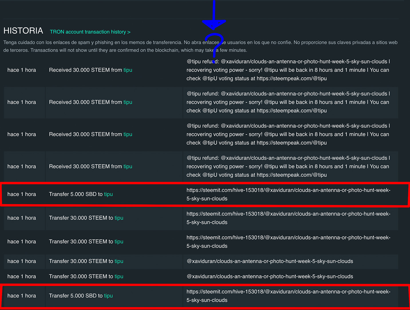 At 16:08 and 16:09 I transfered to @tipu account two transfers of 5 SBD and they have not come back to my account @xaviduran. Of course the attempt was not rewarded.