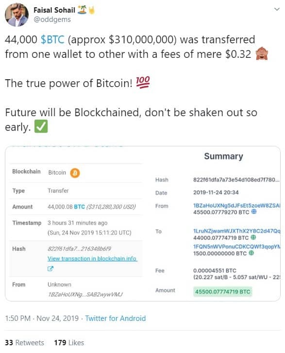 Back in November 2019, a bitcoin whale transferred 44,000 BTC, worth just over $310 million at the time, to another wallet with a ridiculous transaction fee of only around BTC 0.00004551 ($0.32). Mindblowing to say the least! Let’s assume you used a traditional method such as Western Union to wire $310 million… how much do you think the transaction fee will be? You’d have to shell out over $6 million easy and the transfer will most definitely several days as every player in the network takes their cut.