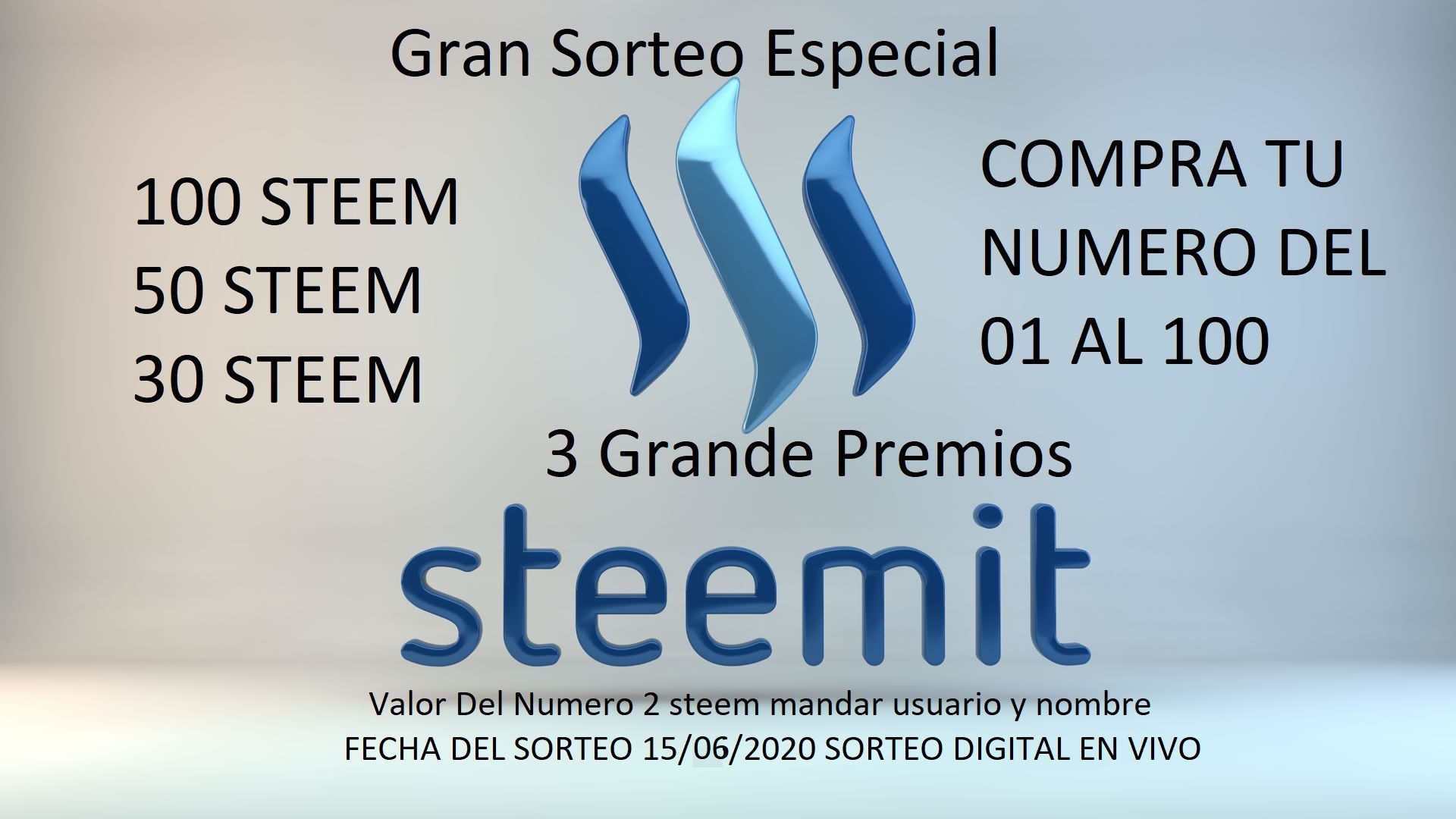 gran sorteo para la gente de steemit son cien numero del 01 al 100 cada numero tiene un costo de 2 steemit el primer ganador es de 100 steem segundo ganador es de 50 steem terce ganados es de 30 steem el sorteo se hace a traves de una pagina web Generador de números aleatorios el dia de sorteo voy hacer un video con la misma fecha del dia el sorteo se realiza el dia 15 junio dia lunes a las 4 p.m hora de venezuela ... no te lo pierda compra tu numero