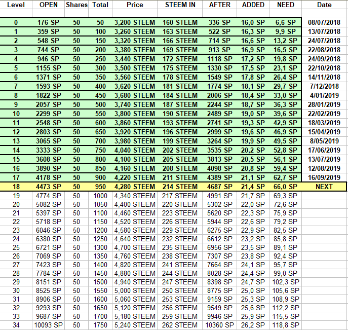 The Account reached 4178SP which opened up Level 17 and made 50 new shares available that were acquired for 4.220 STEEM each (211 STEEM Total). This was Powered Up and 21.1SP (10%) was added on top. The account now needs to reach 4774SP making every share worth 4.280 STEEM to open up Level 18 ...