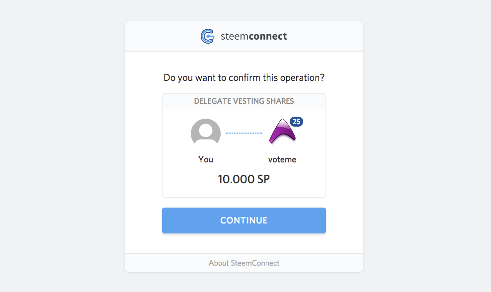 To delegate your Steem Power, simply click one of the following links and click continue button. Sign in into your account to complete delegation.