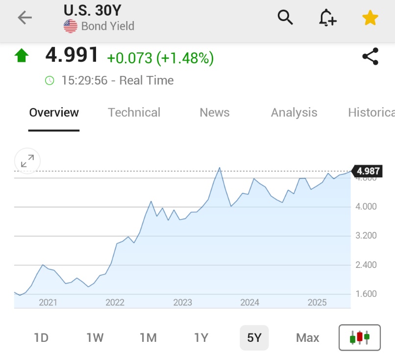 JUST INwallstreetletter (34)in #steemit • 8 months ago U.S. 30-YEAR TREASURY YIELD RISES TO 4.99%, HIGHEST SINCE NOVEMBER 2023 #coinmarcketcap