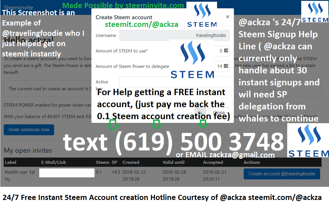 oh by the way I made an instant steem account creation hotline (and email ) , I am just going to start making instant invites for people using steeminvite.com and postng about it to help pay for the costs, see how much I can do to help, I posted on that subreddit r/steemit and alredy someoen requested n intant invite, I believe they will pay meback the 0.1 steem or 30 cents when they make there first payouts, that way I can keep delegatingandpayingfor new accounts, I wonder how many I can help create until HF20 I bet I can do my part to fill in the potholes :D
