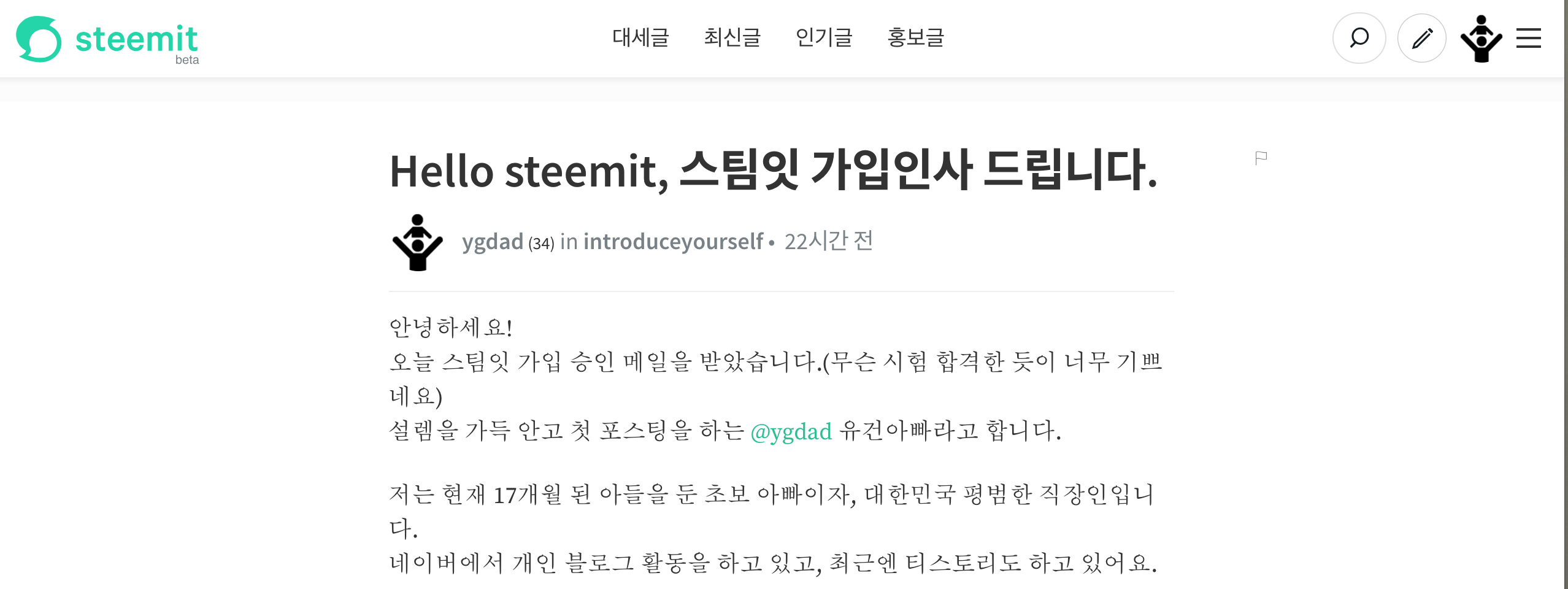 어제 스팀잇 가입인사드리고 오늘 첫번째 글을 쓰게 되네요.