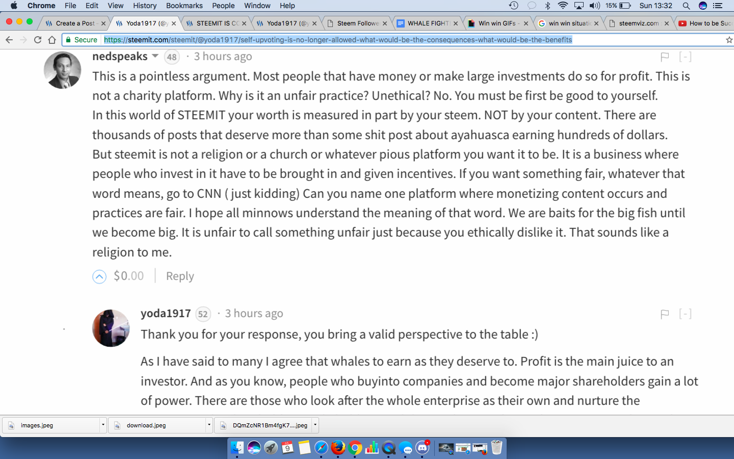 And I really do love @timcliff's idea of partial self upvotes. WHAT IF... A self upvote gave some of the upvote to the author of the thread which cannot be themselves. That may not solve all the despicable practices, but it would add a lot of value and encouragement to many of the writers who put in a lot of blood, sweat, and soul. It would be more towards a win/win situation.