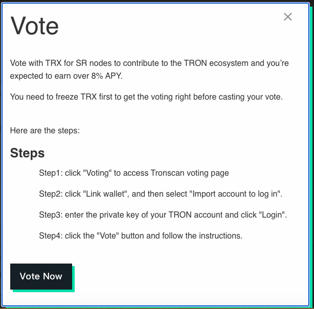 Вы можете внести свой вклад в экосистему TRON, заморозив (застейкав) свой TRX и проголосовав за Супер Представителя (делегата?). Это должно принести вам более 8% APY (годовая процентная доходность).