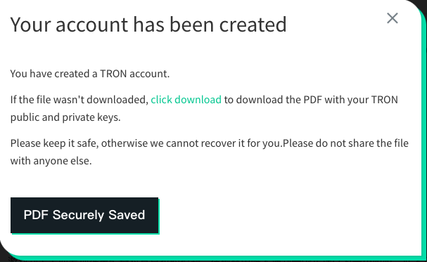 Убедитесь, что Вы загрузили PDF с помощью ключей учетной записи TRON и сохранить его в безопасности!