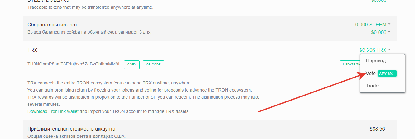 Общий баланс TRX будет отображаться в вашем кошельке Steemit.