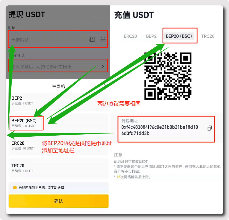 以币安交易所提币USDT至币安交易所为例,我们点击提币后需要选择主网络,这里BEP20(BSC),然后也得选择BEP20(BSC)协议提供的提币地址,然后具有相同协议的提币地址才能顺利完成USDT的转账。
