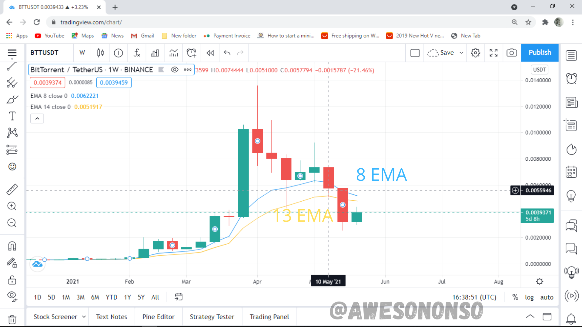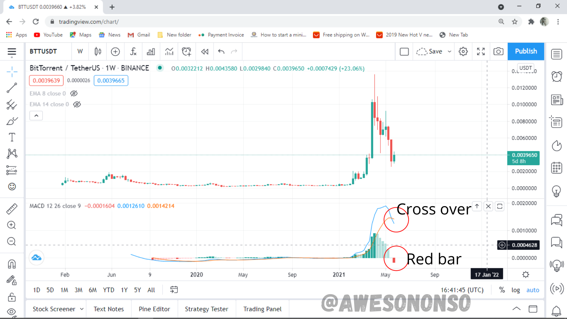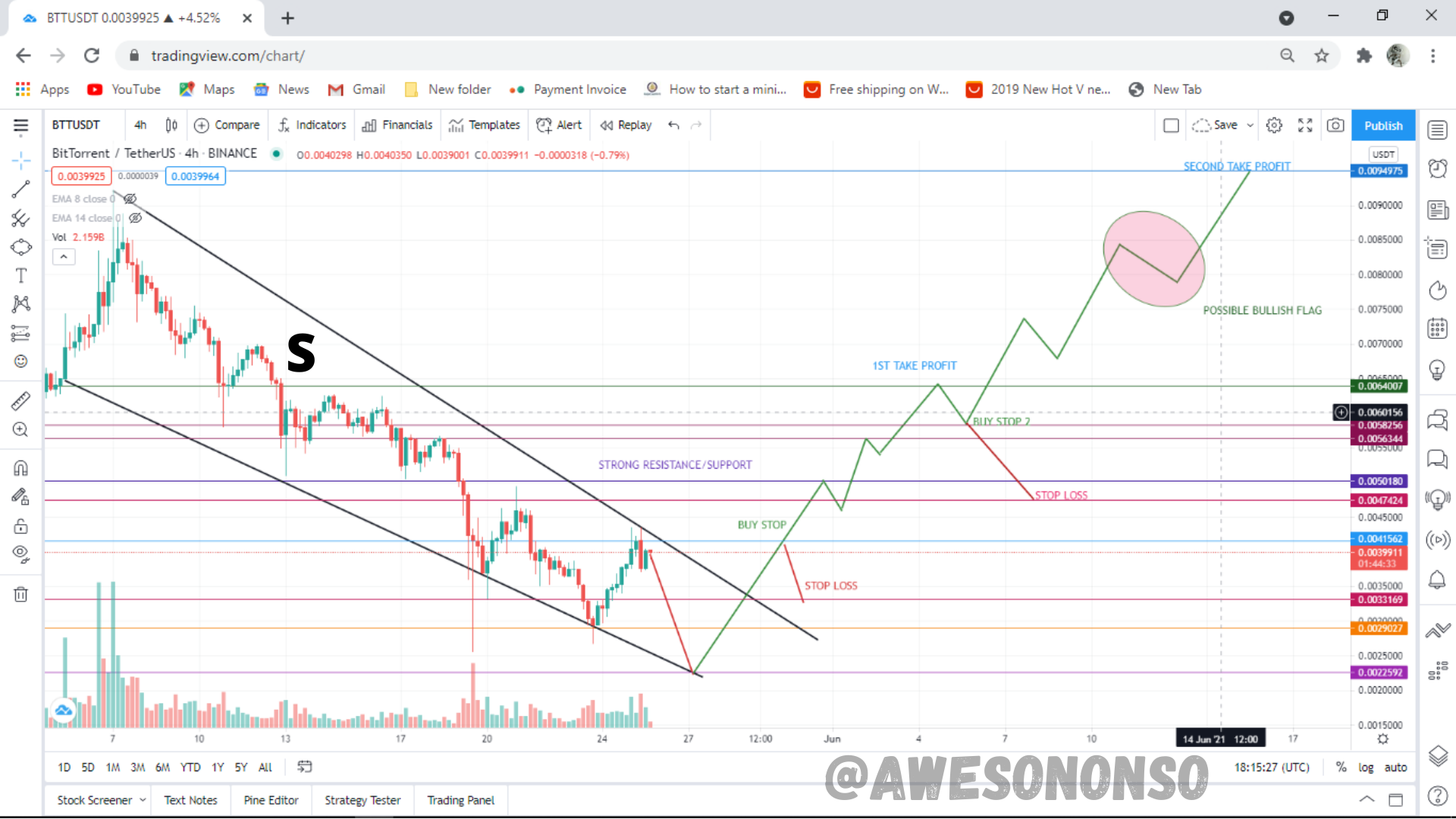 For my illustration I’m going to be using BitTorrent (BTT) on TradingView. Among the types of swing trading mentioned above, we are going to be looking at a breakout trade using the popular Triple Screen Strategy.