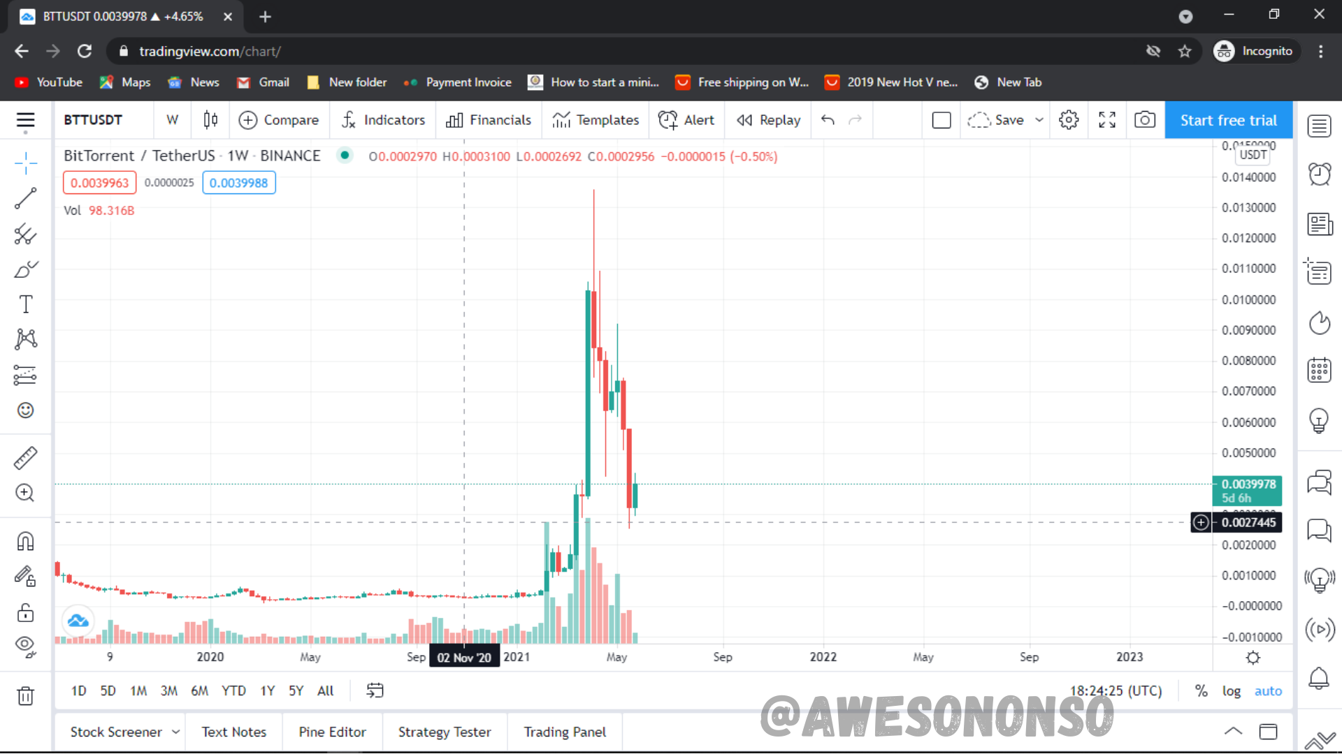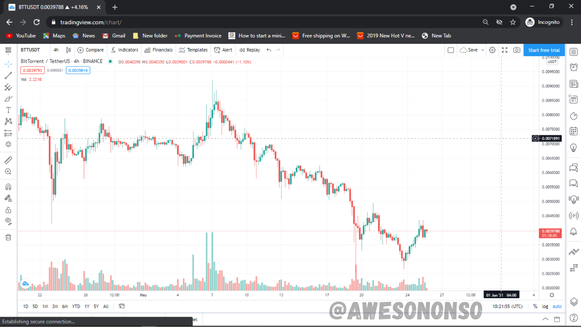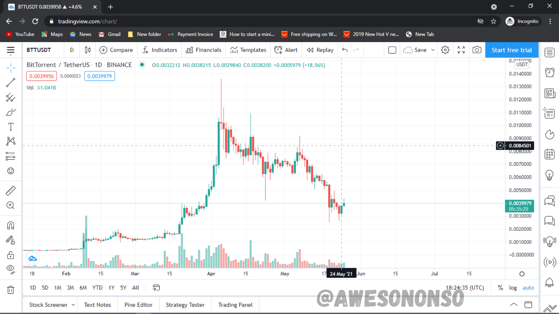 For my illustration I’m going to be using BitTorrent (BTT) on TradingView. Among the types of swing trading mentioned above, we are going to be looking at a breakout trade using the popular Triple Screen Strategy.
