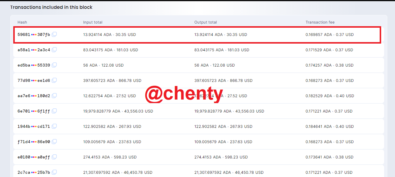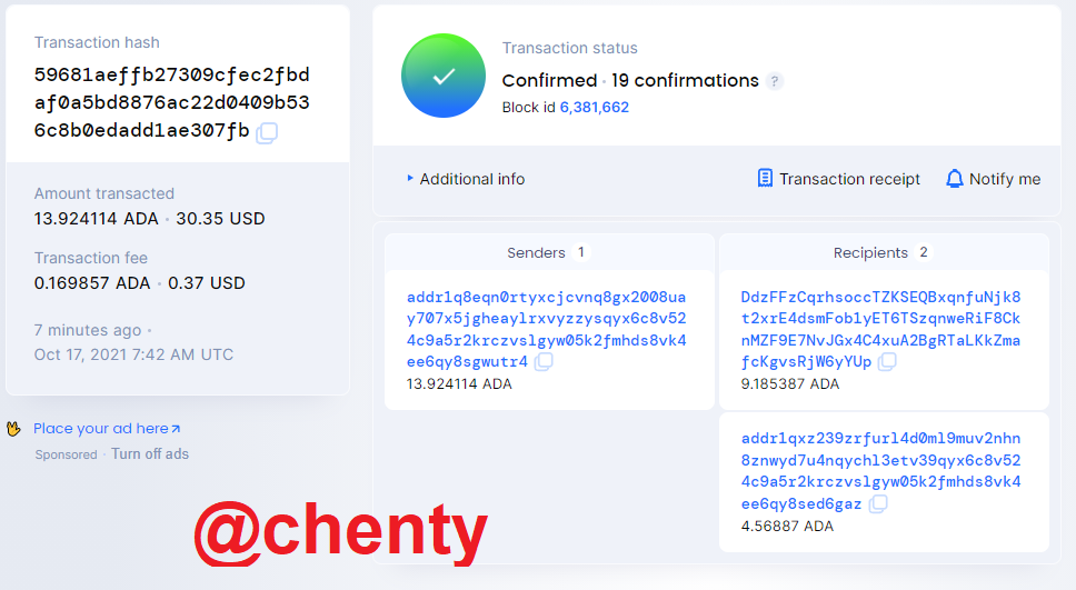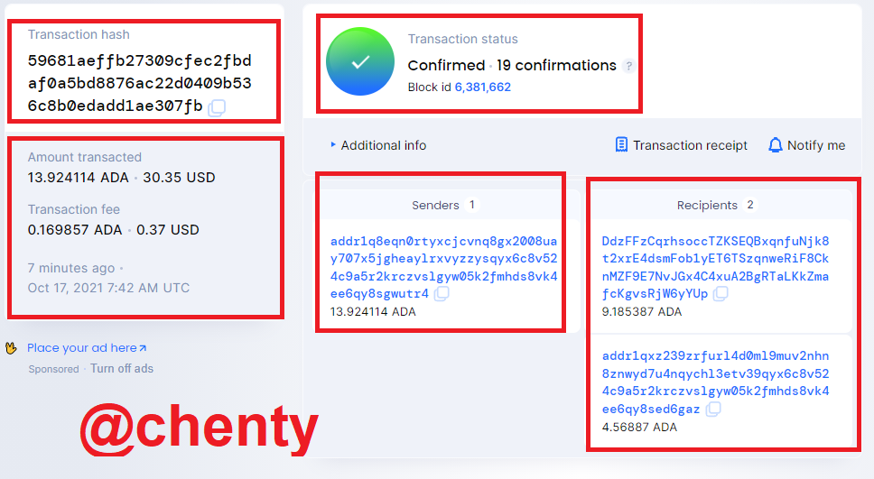 - I observed that the transaction is confirmed an amount transacted = 13.094114 ADA = $30.35, transaction fee = 0.169857ADA = 0.37USD, has 1 sender with address addr1q8eqn0rtyxcjcvnq8gx2008uay707x5jgheaylrxvyzzysqyx6c8v524c9a5r2krczvslgyw05k2fmhds8vk4ee6qy8sgwutr4 and 2 senders with addresses DdzFFzCqrhsoccTZKSEQBxqnfuNjk8t2xrE4dsmFob1yET6TSzqnweRiF8CknMZF9E7NvJGx4C4xuA2BgRTaLKkZmafcKgvsRjW6yYUp and addr1qxz239zrfurl4d0ml9muv2nhn8znwyd7u4nqychl3etv39qyx6c8v524c9a5r2krczvslgyw05k2fmhds8vk4ee6qy8sed6gaz with an amount of 9.185387 ADA and 4.56887 ADA respectively.