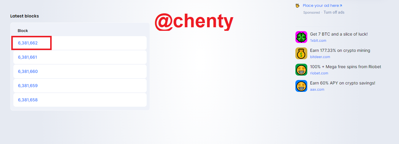 - From the result, scroll down and from the list of latest blocks click on any of them. I click on the first 6,381,662.