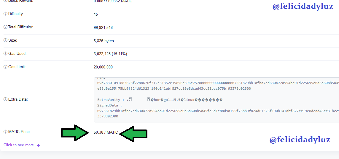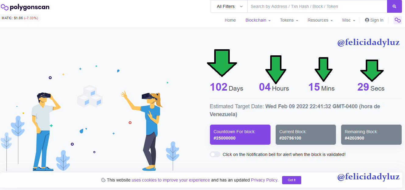 Como bien se ve, la plataforma me presentó en ese momento que faltaban 102 días, 4 horas, 15 minutos y 29 segundos para que se produjera el bloque número 25.000.000 en la red de Polygon. El tiempo estimado por la red para que eso pase, será exactamente el 09 de Febrero de 2022 a las 4 de la tarde (hora de Venezuela).