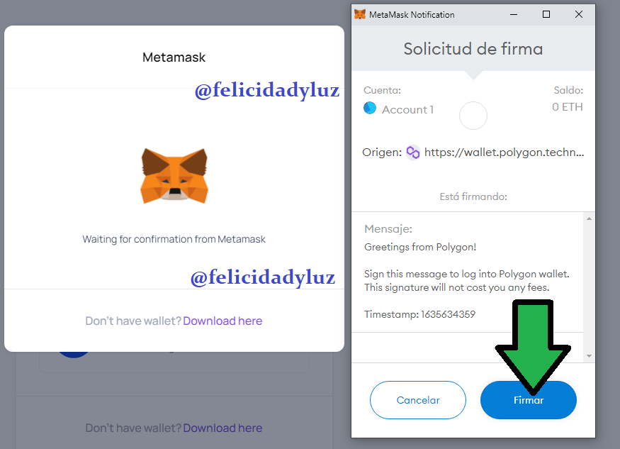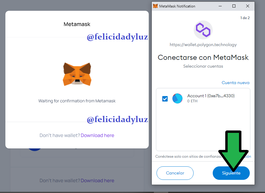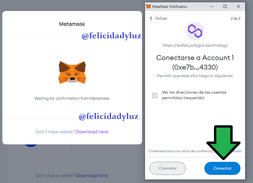 Entonces, como deseo hacer la conexión de mi Wallet de Metamask con la Wallet de Polygon que estoy creando, hago click en la opción que corresponde. Luego de eso, solo espero por confirmación, como ven en la imagen de abajo.