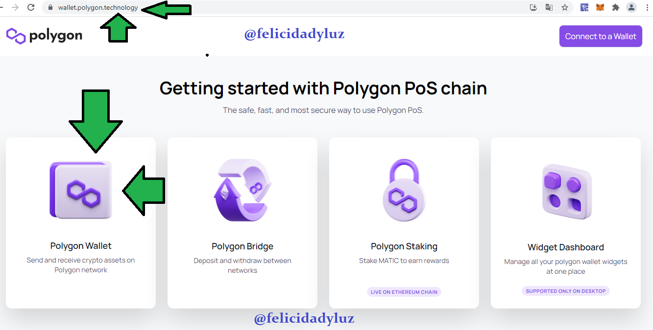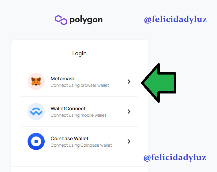 Posteriormente, me dirijí en la barra de direcciones a https://wallet.polygon.technology/, como pueden visualizar en la imagen anterior. Al hacer click en el recuadro de "Polygon Wallet", se me abrió la siguiente pestaña de opciones: