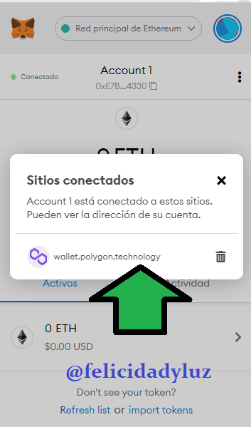 Y ya con esto he conectado exitosamente mi wallet de Metamask con mi Wallet de Polygon, como pueden notar en la imagen que sigue.