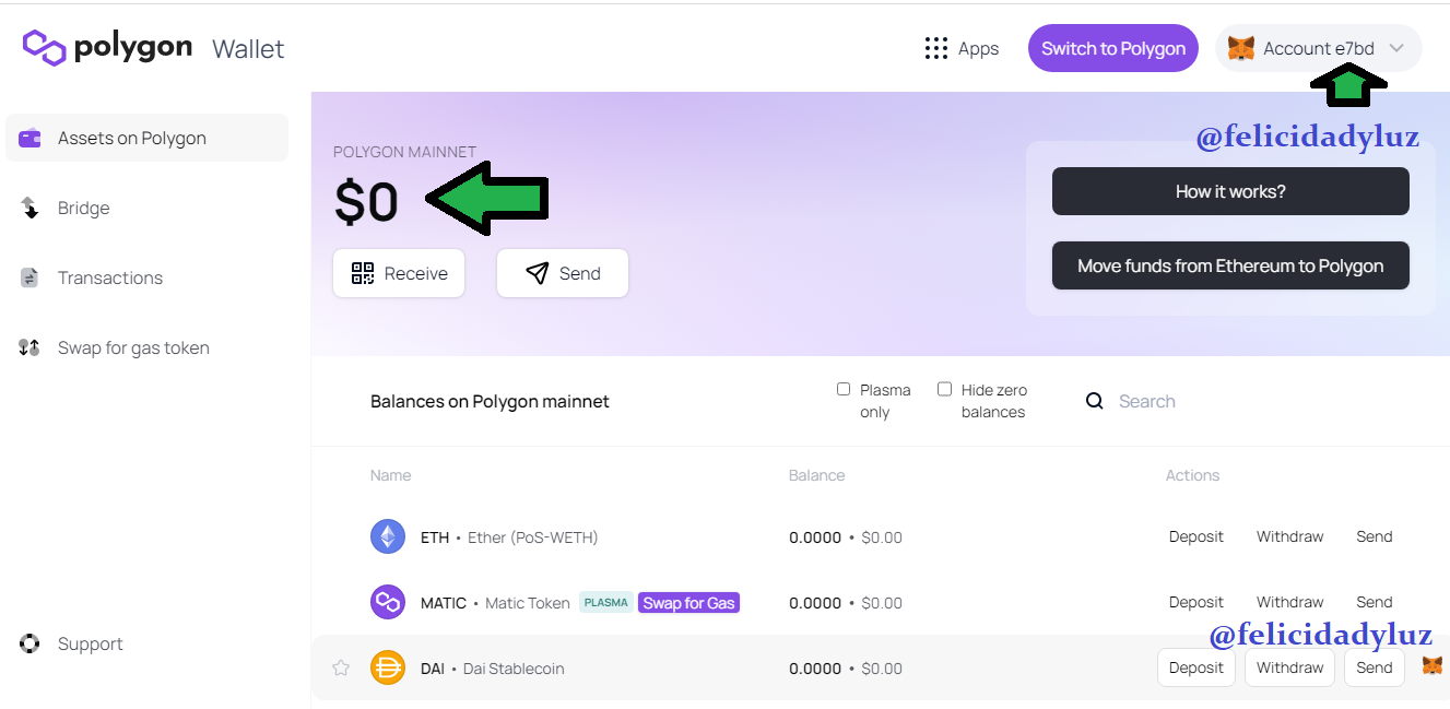 Y por lo que pueden ver en la imagen de arriba tenemos la comprobación total de que he conectado exitosamente mi wallet de Metamask a mi wallet de Polygon.