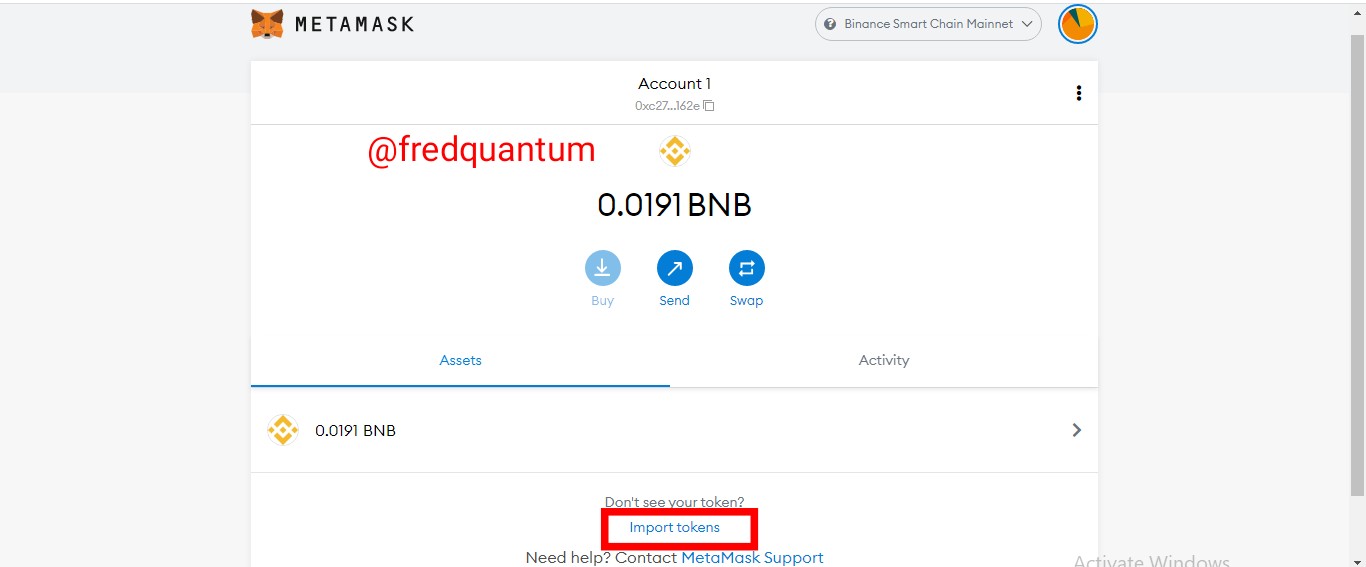 - To start the import process, I launched my MetaMask wallet and at the bottom of the page, I selected Import tokens, and on the next interface, I pasted the Contract address. The symbol and the decimals surfaced automatically, and I clicked the Add Custom Token button. See the screenshots below.