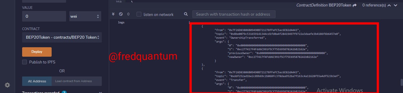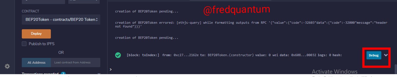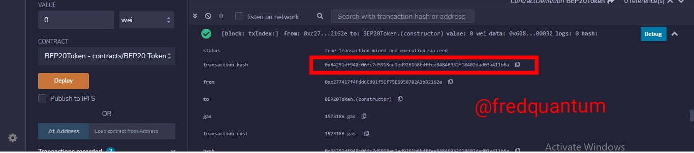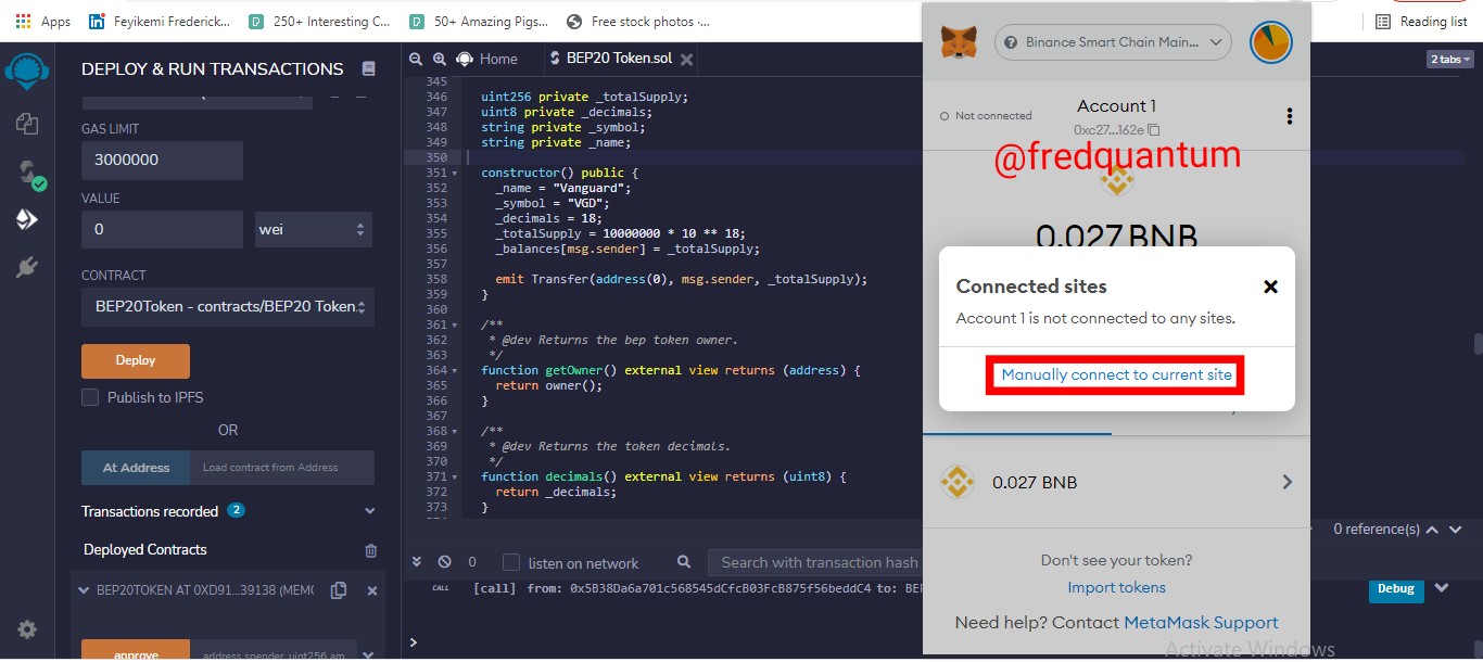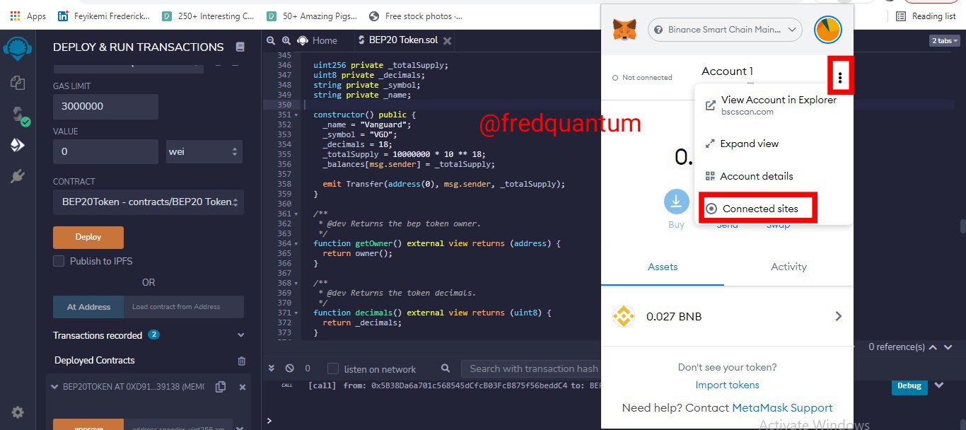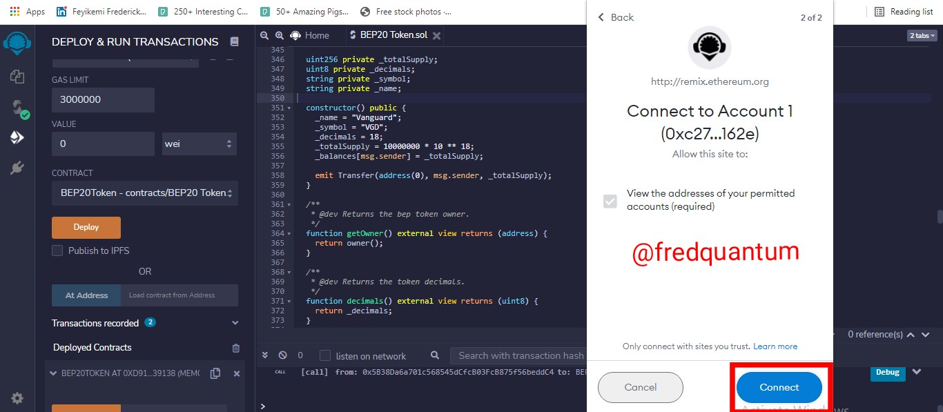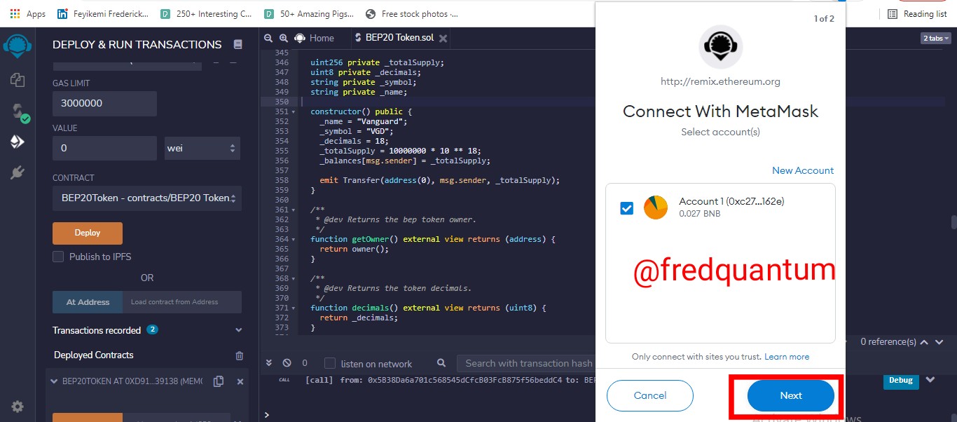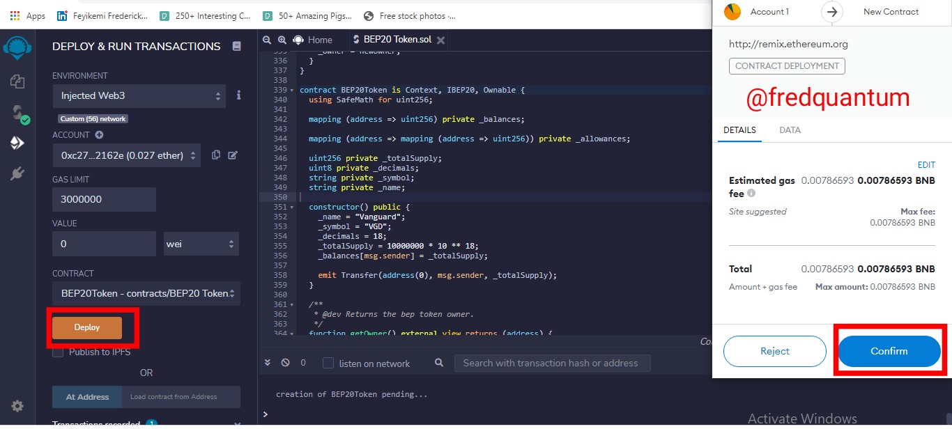 - At this stage, I clicked the deploy button, the estimated gas fee is 0.00786593 BNB and I confirmed the transaction on the MetaMask wallet.