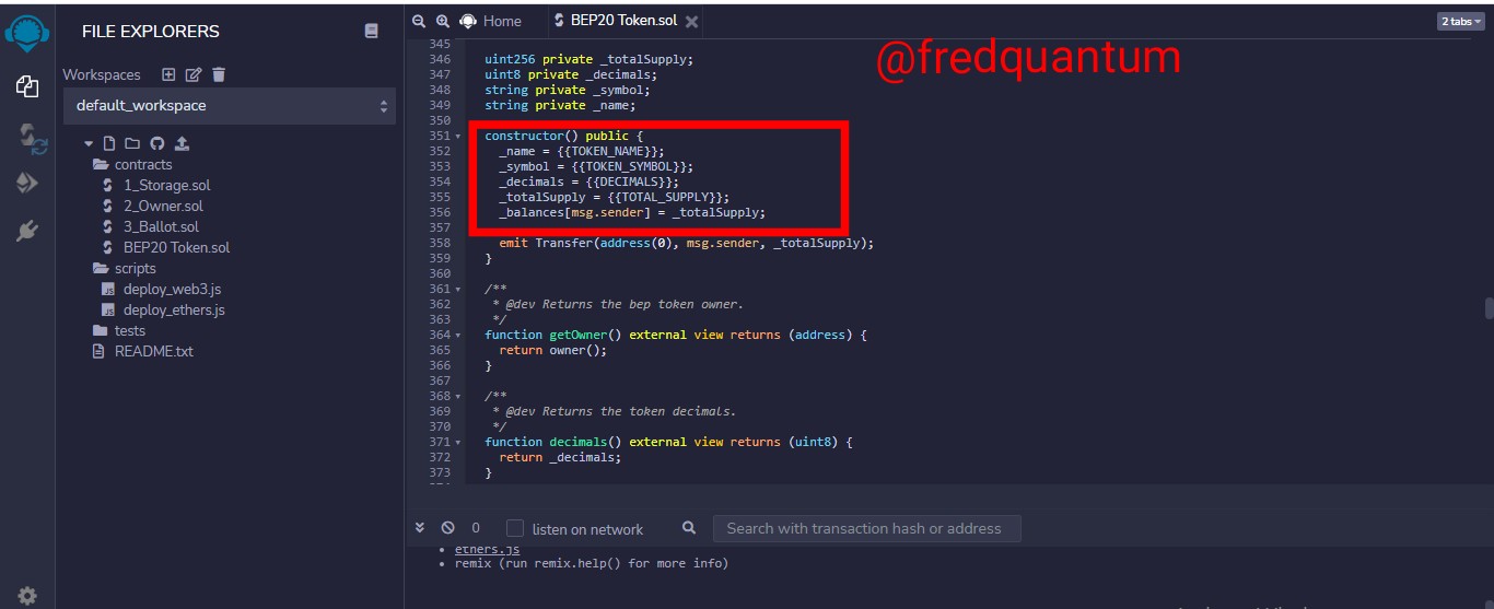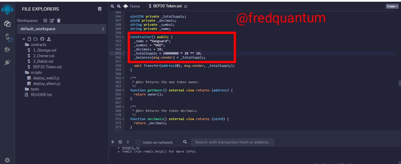 - name: This is the name of the token we are about to create. Every cryptocurrency has names like Ethereum, Bitcoin, Algorand and so on, likewise, in the line of the code, we have to assign a distinctive name for the new project.