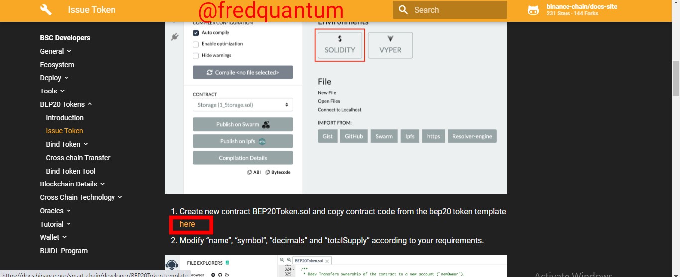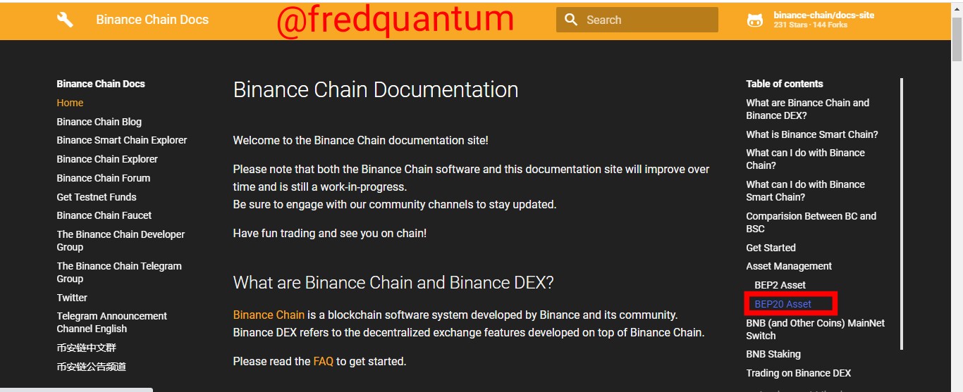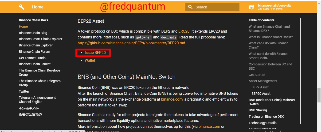 - The first step is visiting https://docs.binance.org/ and on the landing page, under the table of content, I selected BEP 20 Asset which was followed by selecting the option Issue BEP20 on the details of BEP20.