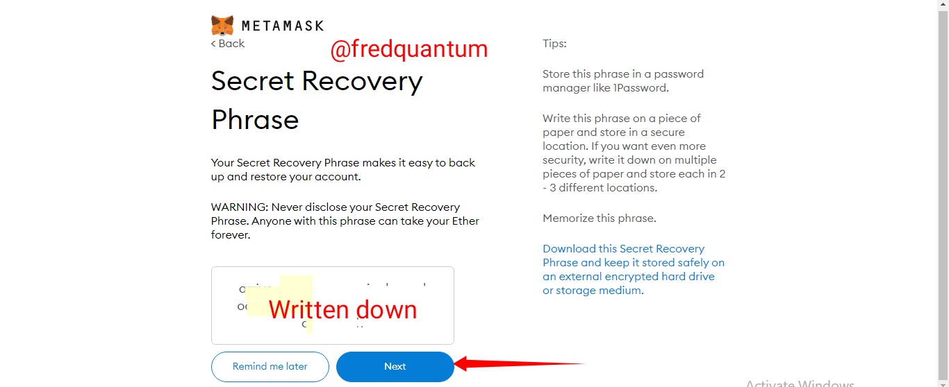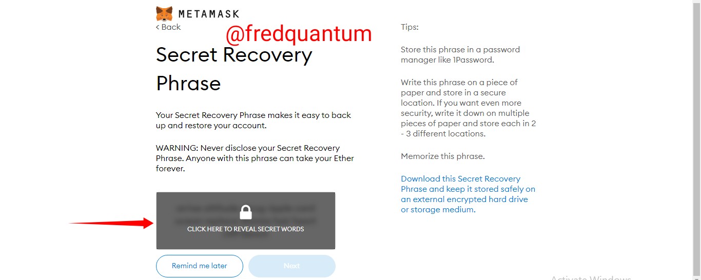- It's time to backup the recovery phrase, I clicked to reveal the secret, wrote the secrets down, and clicked on the Next button. See the screenshots below.