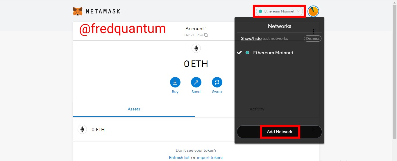 - To add the Binance Smart Chain Mainnet to the MetaMask wallet, the process starts by selecting the network's drop-down button at the top of the page, then selected Add Network.