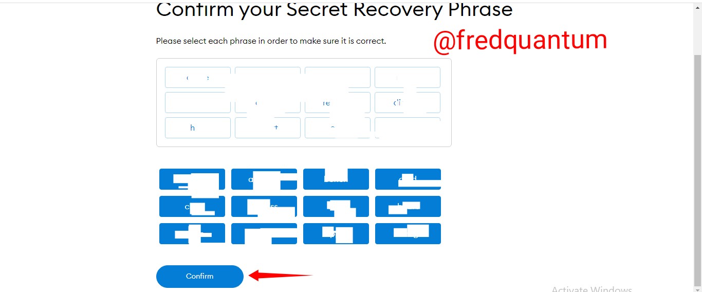 - On the next interface, I am required to input the secret words in order, I did that and clicked the Confirm button. The wallet setup was completed. See the screenshots below.