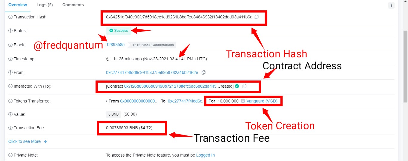 Some of the details above are the transaction Hash, status (success), block (12893585), contract address, transaction fees (0.00786593 BNB ~ $4.72), the transaction purpose (10,000,000 Vanguard tokens creation), timestamp and so. I have given most of these earlier in the context.