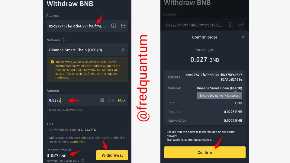 - To deposit BNB into the newly added Smart Chain wallet, I launched my BNB wallet from an exchange, inputted the address, amount (0.027 BNB ~ $16) to be sent excluding withdrawal fee and confirmed the withdrawal.