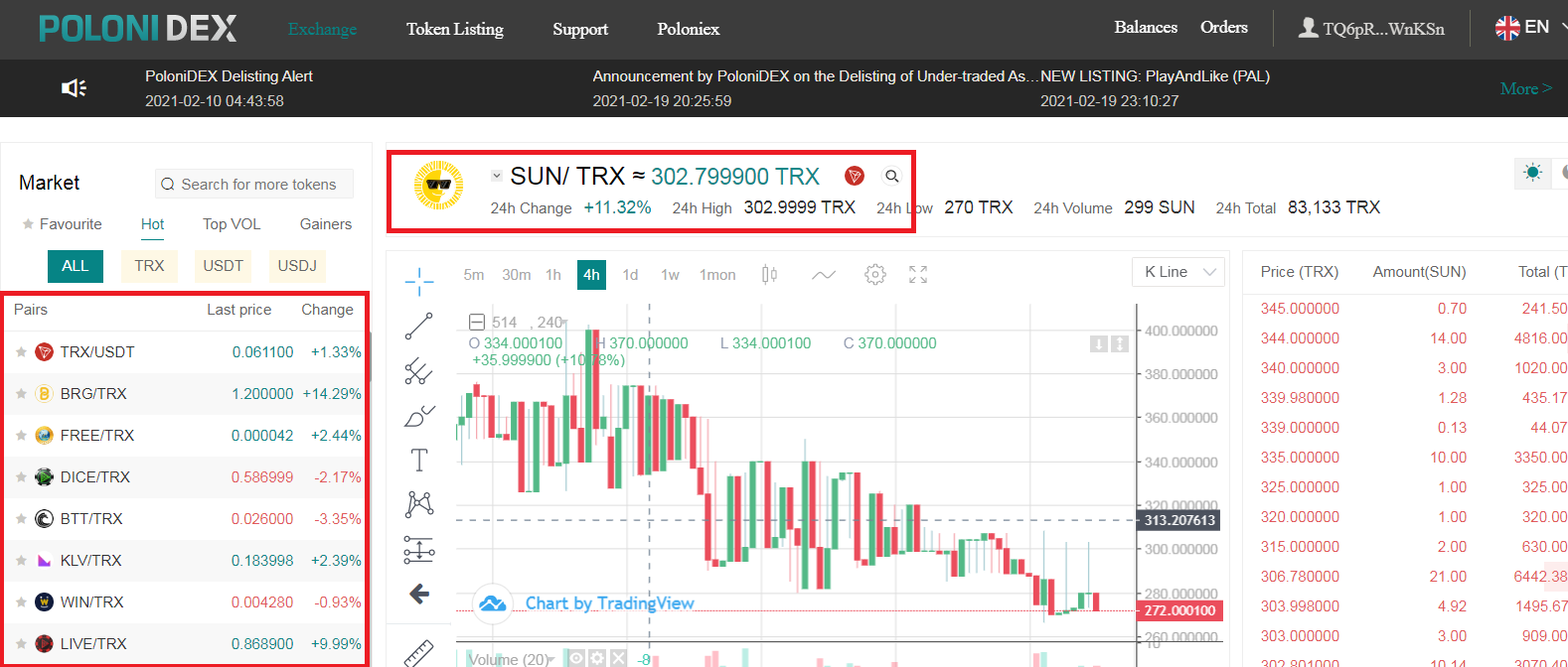 - Using the scale on TRONLink, you can place an order, selecting one of the pairs presented for example SUN / TRX, KLV / TRX, BTT / TRX. Poloni DEX also displays the transaction history and the order book.
