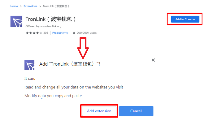 https://chrome.google.com/webstore/detail/tronlink/ibnejdfjmmkpcnlpebklmnkoeoihofecAdd the extension to Chrome. A box appears asking you to click Add an extension. Click on it. It will be installed in your browser.