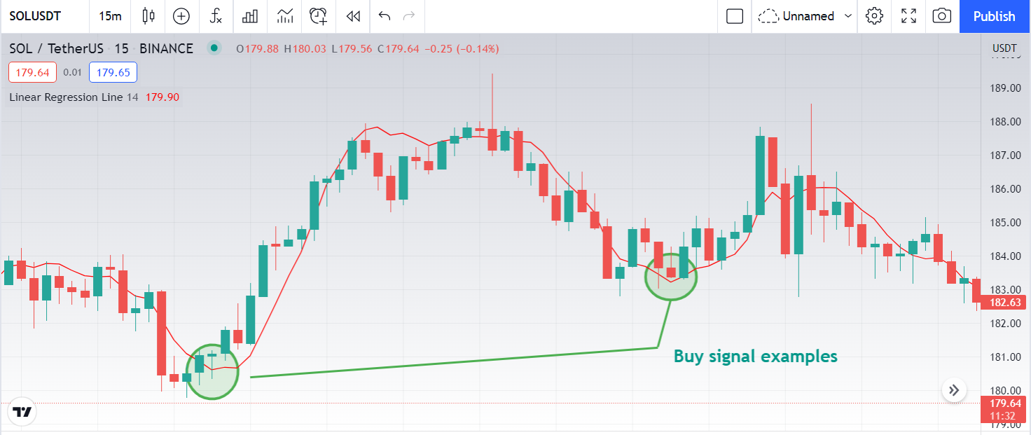 The most common use of Linear Regression is to go buy or sell in the direction of Linear Regression, as shown in the graph below.