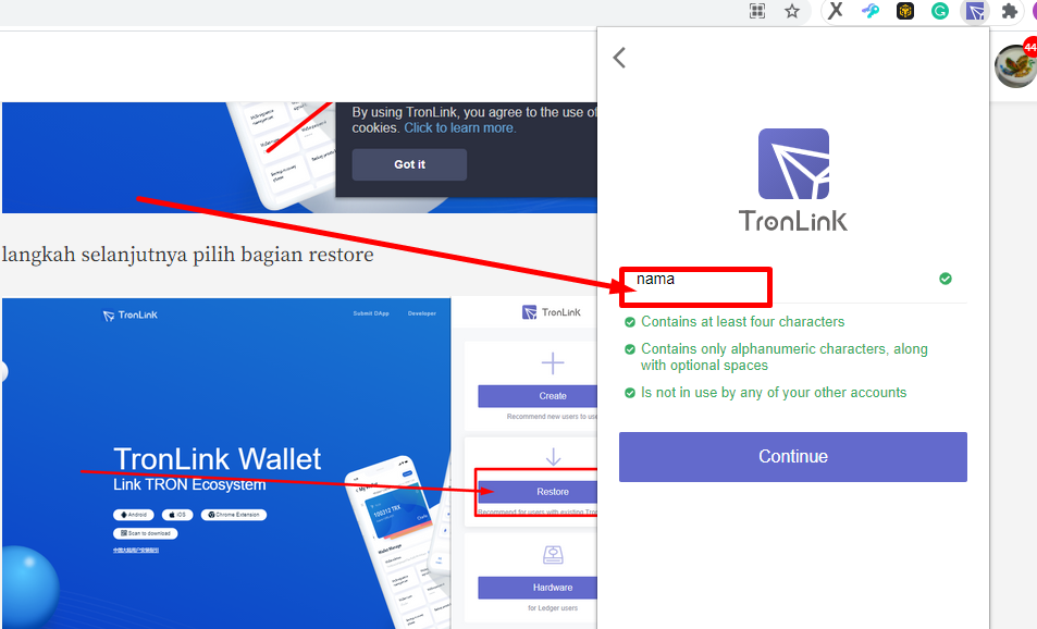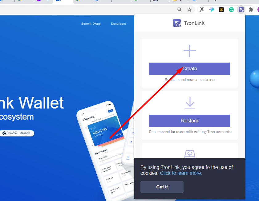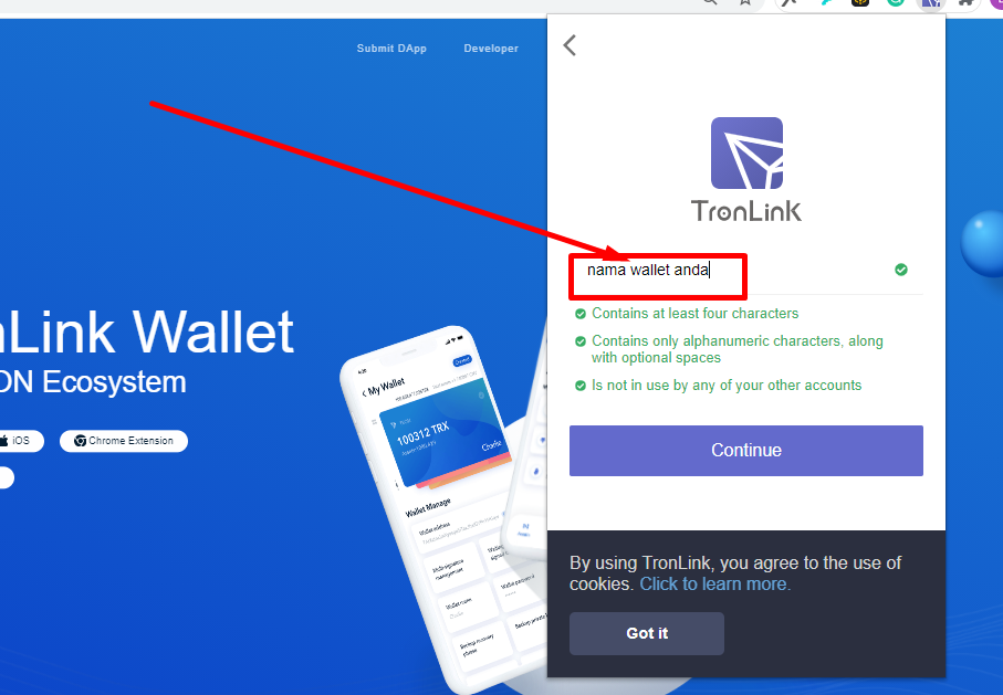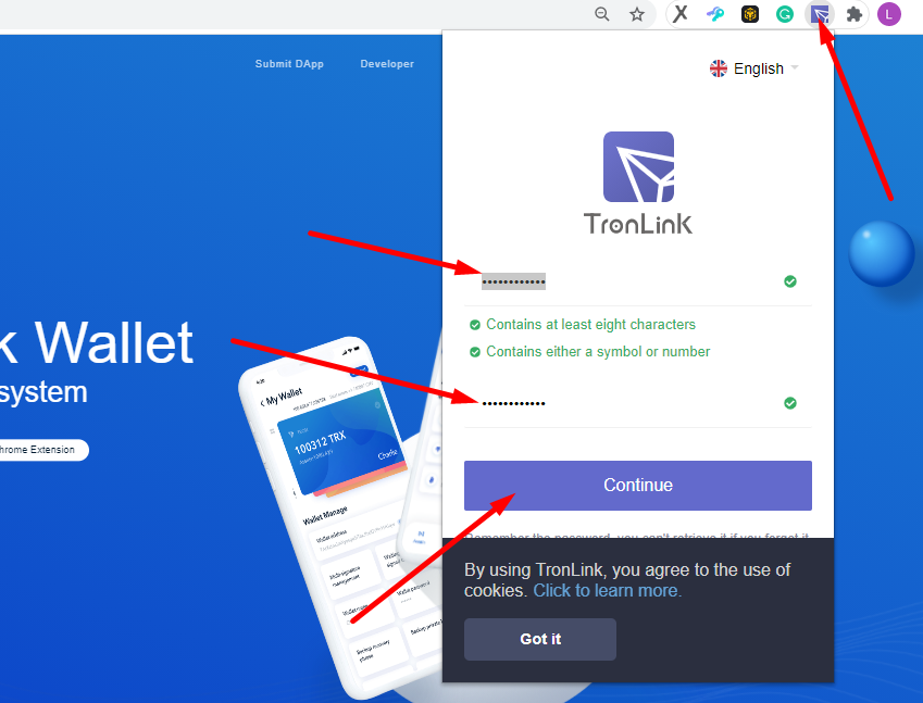 Klik ikon TronLink di browser Chrome Anda. Saat Anda menginstal TronLink, mereka akan meminta kata sandi Anda dua kali. Pastikan Anda menuliskan ini dengan jelas di dan menyimpan kata sandi anda di tempat yang aman. Jangan sampai hilang.