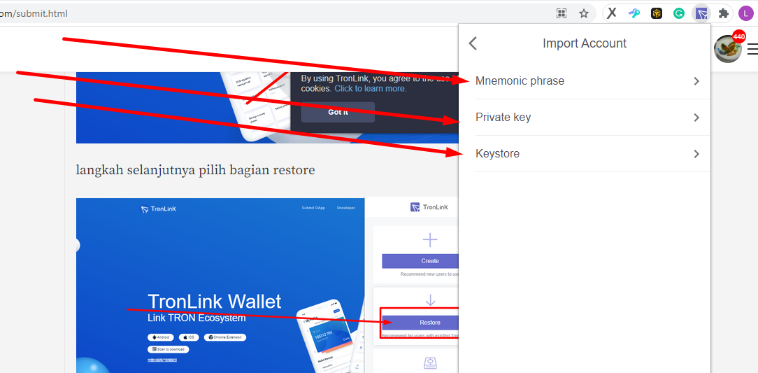 3.Cara Mengembalikan akun wallet Tronlink anda dengan PRIVATE KEY atau MNEMONIK TRONLINK