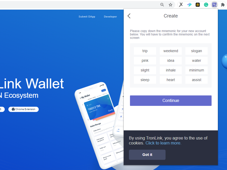 Anda akan diberikan mnemonics '12 kata ' yang harus juga Anda simpan dan JANGAN BERBAGI dengan siapa pun. Ini adalah kuncimu. Jika karena alasan apa pun Anda tidak bisa masuk ke komputer, Anda dapat menginstal ulang TronLink dan masuk ke Wallet Anda dengan 12 kata mnemonics ini.