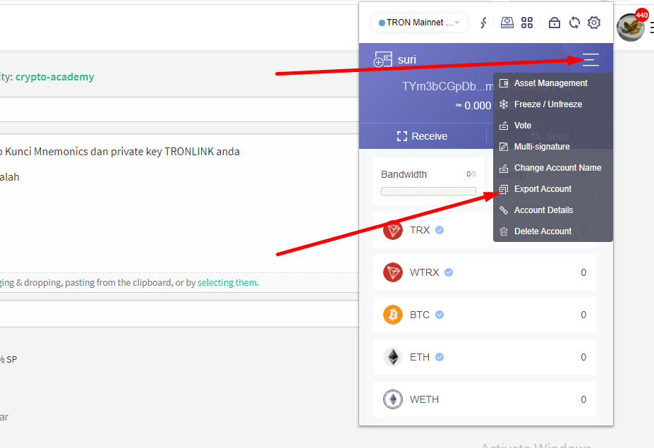 2.Lakukan Backup Kunci Mnemonics dan private key TRONLINK anda