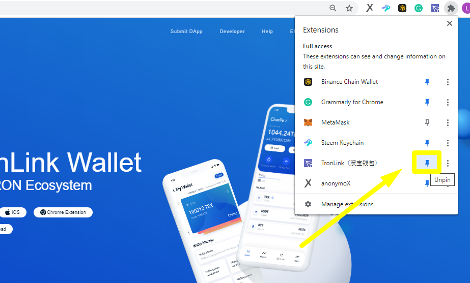 Setelah Anda memasang ekstensi TronLink, Chrome mungkin menyembunyikannya. Klik Pin dan 'sematkan TronLink' agar selalu terlihat di browser Chrome