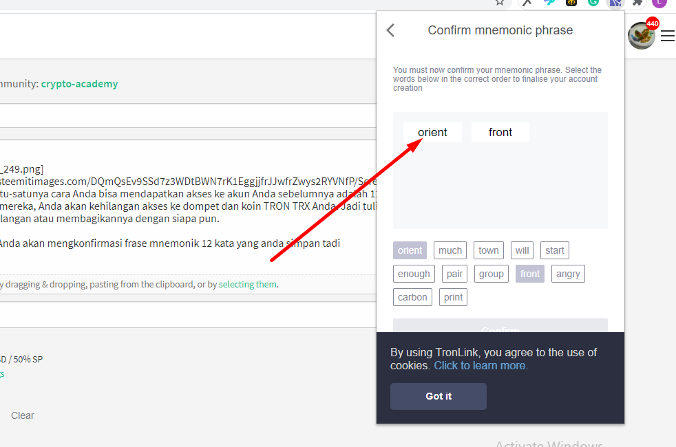 CATATAN: Satu-satunya cara Anda bisa mendapatkan akses ke akun Anda sebelumnya adalah 12 kata inti alias kunci Anda. Tanpa mereka, Anda akan kehilangan akses ke dompet dan koin TRON TRX Anda. Jadi tuliskan ini dan JANGAN PERNAH kehilangan atau membagikannya dengan siapa pun.