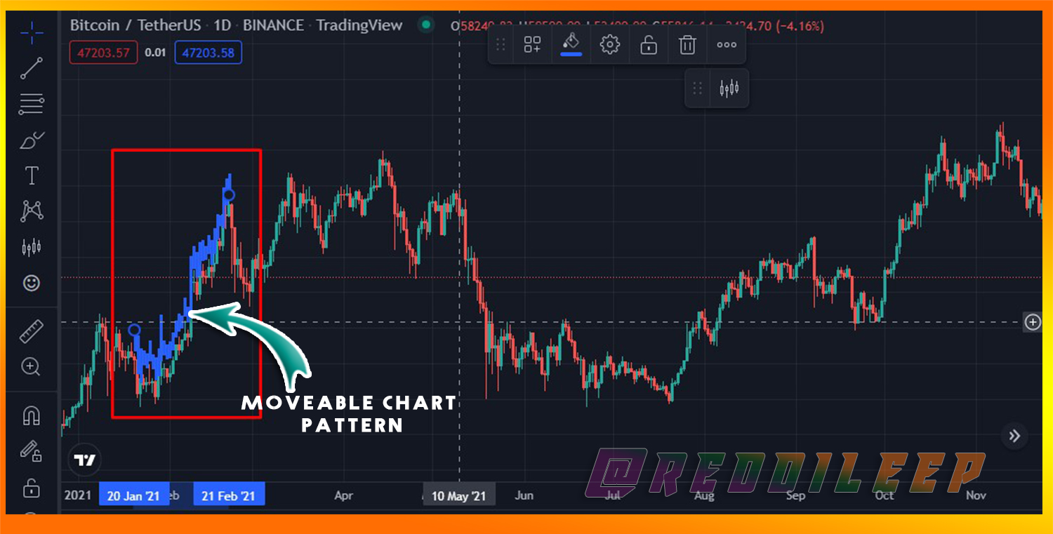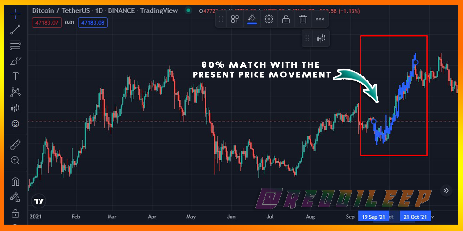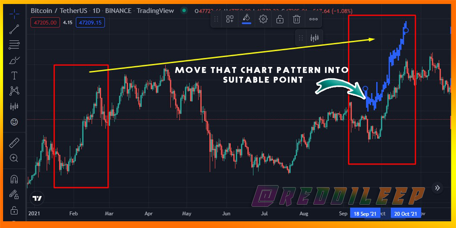 Here we need to compare the chart with the past data as explained earlier. Here we have to check whether the chart pattern of the previous Bull Run or Bearish Run is similar to the present price chart. For example, the pattern on a long-term bitcoin uptrend price chart in the past can be used to find the trend reversal point in the current bitcoin uptrend movement. Let's explore it in the charts.
