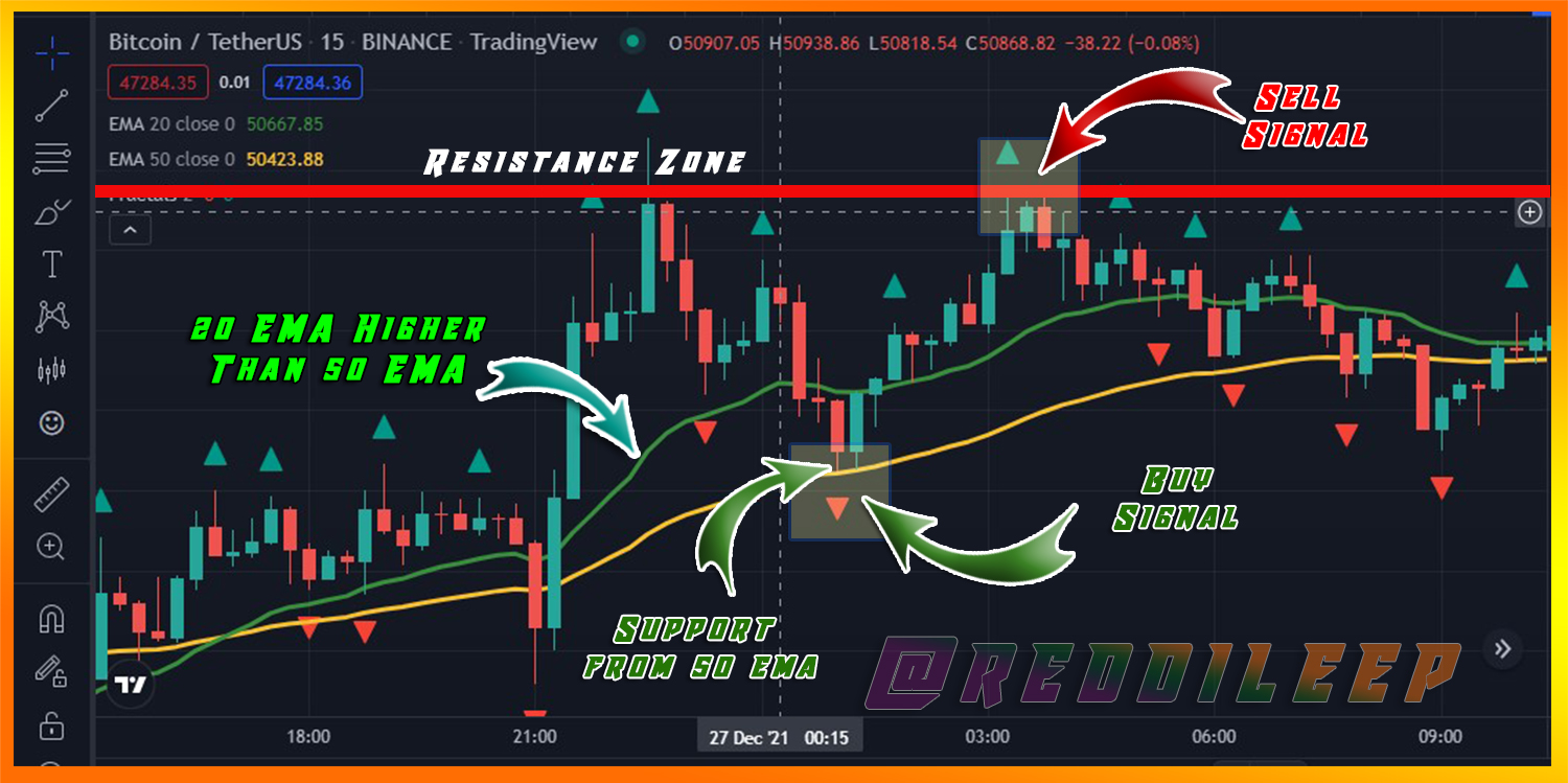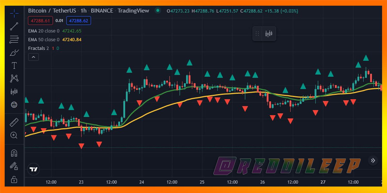 Finally, we can wait for a suitable entry point like the below screenshot. Here I have taken my entry point where the price movement got supported by 50 EMA and received signals to buy from Fractal Indicator.