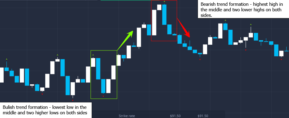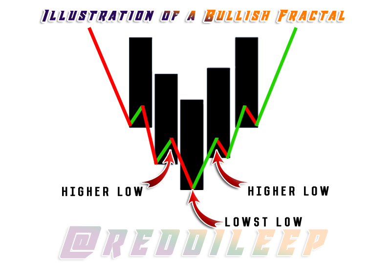 In order for a Bullish Fractal to occur, the candle in the middle of the fractal has the lowest low and the candles on either side have the higher lows. Let me explain it further using a simple illustration.