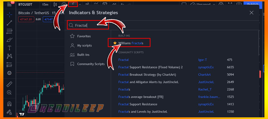 So, here I will discuss a few things about Williams Fractals Indicator. In fact, we can get this indicator on the chart from any trading platform including TradingView. First of all, I will add this indicator to a crypto chart.