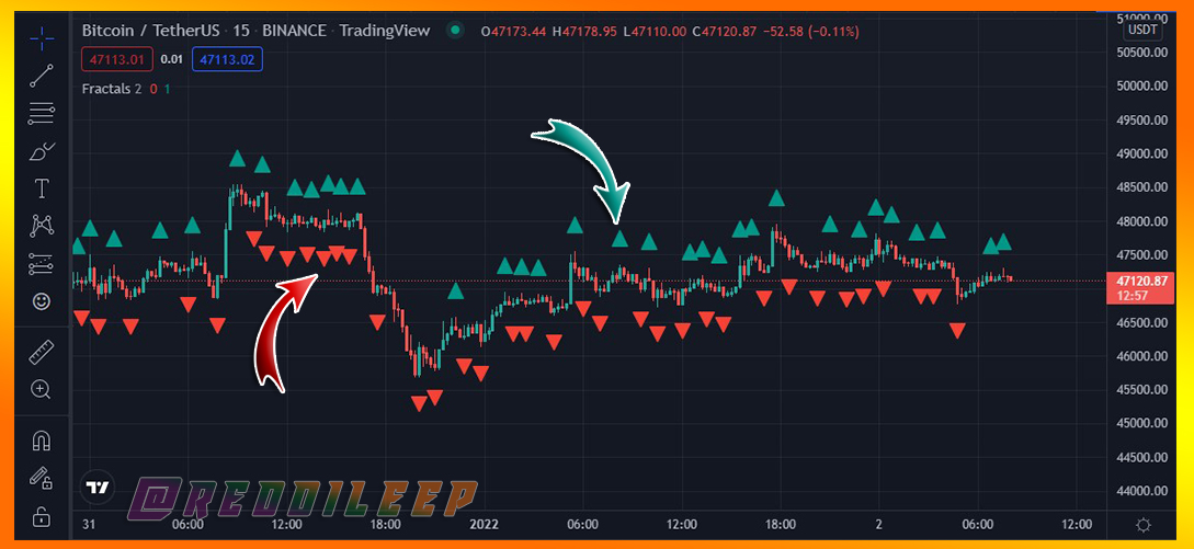 If we look at the appearance of this indicator, we can see a lot of Green arrows and Red arrows in our trading chart. In fact, this indicator shows extreme points in the relevant Crypto Chart. It means this indicator helps us to identify reversal points in our chart by showing Up and Down arrows. Here the Green Up arrows can be defined as the Buy Fractal and the Red Down arrows can be defined as the sell arrow. In addition to this, there is a lot more information to discuss this indicator and we will talk about that later.