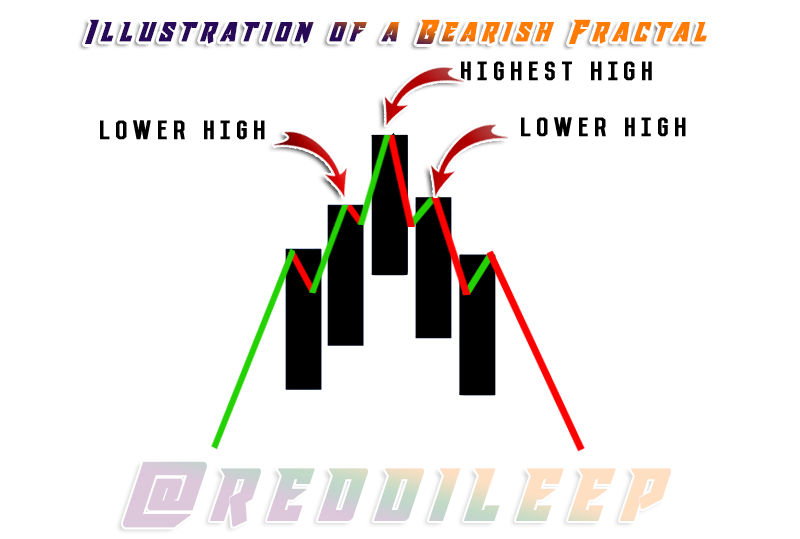 - In order for a Bearish Fractal to occur, the candle in the middle of the fractal has the highest high and the candles on either side have the lower highs. Let me explain it further too using a simple illustration.